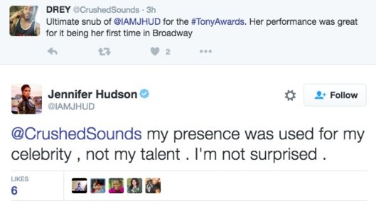 When the Tony nominations were announced this morning, most people were quick to analyze just exactly how well Hamilton fared. (Record breaking! Surprised?) But when the initial excitement dissipated a bit, one thespian spoke out regarding her lack of nomination — and her subsequent lack of surprise. Jennifer Hudson, who made her Broadway debut as nightclub singer Shug Avery in the revival of The Color Purple, was quick to respond to a fan on Twitter who denounced her snub in a now-deleted tweet: