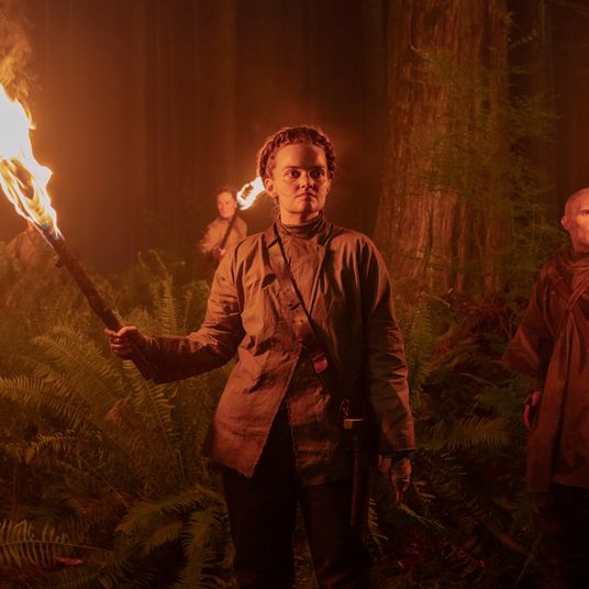 There’s another layer here, though, and it’s racial-political — or at least it could be; as I said up top, Glover traffics in analogies and symbols, but he’s very open-ended in how he deploys them, going for plausible deniability so that he can just say, “Oh, that egg is just an egg,” etc. I don’t think it’s an accident that the mansion where these two black men live resembles a plantation (as the house in Get Out did), or that Darius begins the story by ironically purchasing a cap with a confederate flag symbol and “Southern Made” and then defacing it with a red Sharpie so that it reads “U Mad,” or that Teddy’s face is whitened like Michael Jackson (a reaction that Jackson said was a result of vitiligo, while armchair psychologists attributed it to both racial self-loathing and an abused child’s wish to obliterate any trace of his old self). I don’t think it’s random, either, that when Teddy leads Darius into his shrine room, the “father” is white and looms over the two black men, one of whom (Teddy) is out of his mind with pretzel-logic adoration while the other (Darius) looks on with appalled amazement.