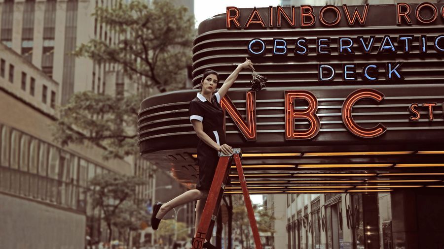 “I was talking to a friend of mine in a cab on the way to work that day, and we were brainstorming ideas for Sarah. I knew I wanted to shoot her outside. We came up with this idea of dusting off the NBC sign. I ran in and it was a very last-minute idea. I rushed Sarah out the door to do it, and she was really excited. We brought a ladder out; there were some security guards around her. We completely did it guerrilla style. I nearly got fired for it. You can’t do anything with the building. You have to get permits, permission, all that. All hell broke loose after it was over because it wasn’t a good idea for me to do it without asking. [Laughs.] You can’t just put a massive ladder against their sign! But we did and it worked out.”